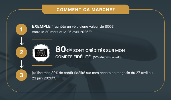 Pour l’achat d’un vélo, profitez de 10% du prix crédités(1) sur votre cagnotte fidélité, sans limite de montant.